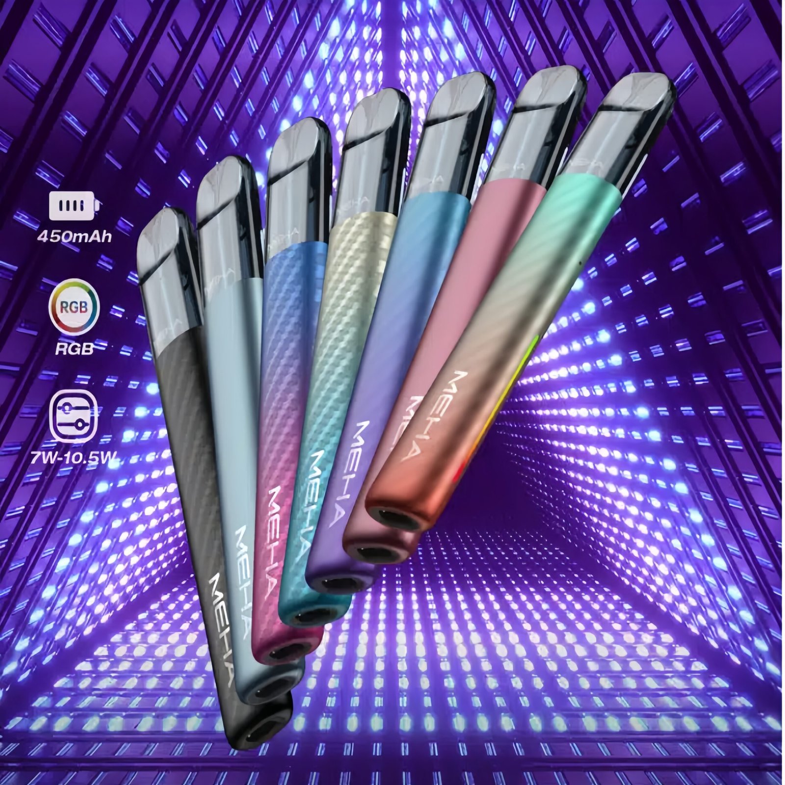 MEHA 魅嗨五代主機結合時尚外型與強效性能,搭載三段功率調節與炫彩氣氛燈,抽感細膩穩定,無論新手或老玩家都能輕鬆上手。