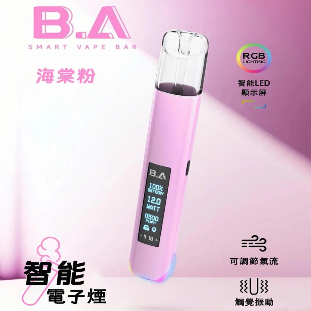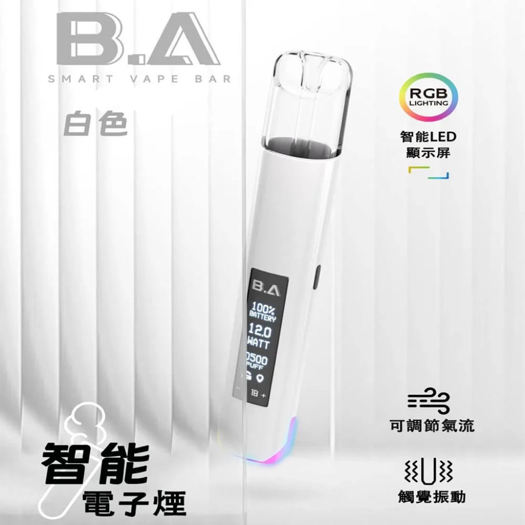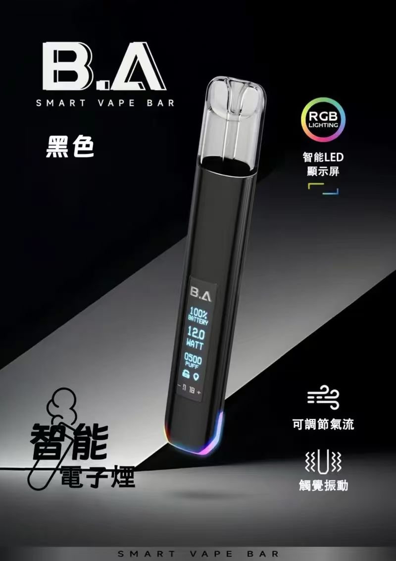 一次性拋棄式B.A Smart Vape Bar 重新定義電子煙體驗:智慧 LED 螢幕即時顯示電量、功率與吸口數,可調氣流讓你自訂每一口的濃郁度,RGB 氛圍燈隨使用變換色彩,搭配震動回饋提醒,是科技潮人必備的電子煙桿。